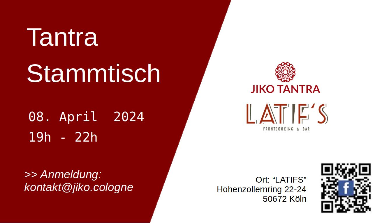 Der JIKO Tantra Stammtisch findet am 8. April 2024 von 19.00 bis 22.00 Uhr im „LATIF’s“ Frontcooking Bar Hohenzollernring 22-24 , 50672 Köln statt. Freu Dich mit Komala und Jina und einer Gruppe von Herzensmenschen auf einen zwanglosen Abend. Sei Dir und uns Willkommen, bei köstlicher marokkanischer Küche.