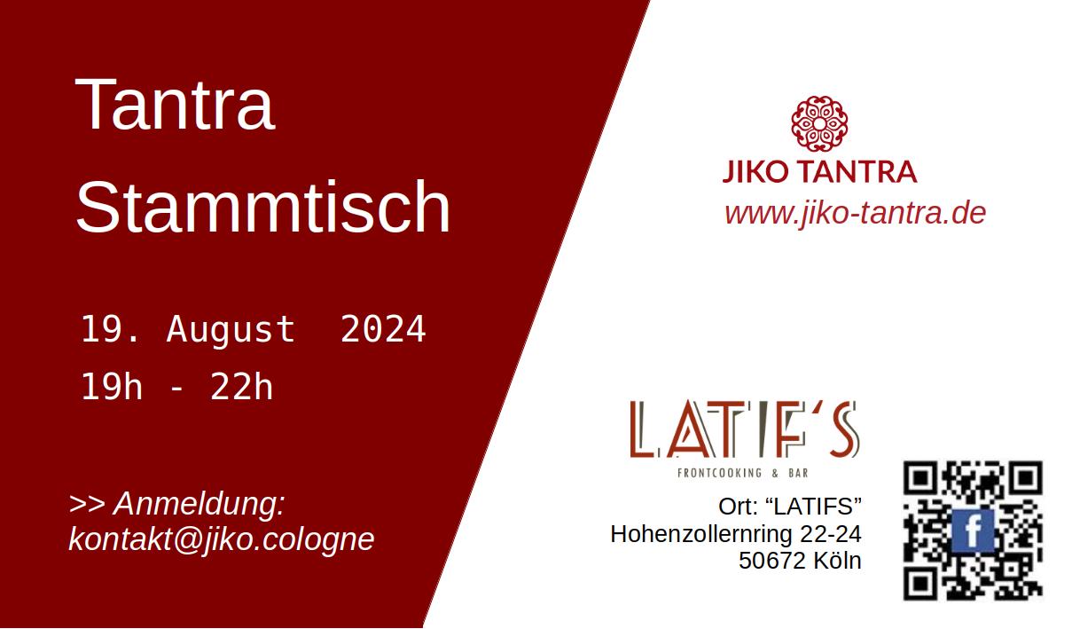 Der JIKO Tantra Stammtisch findet am 19. August 2024 von 19.00 bis 22.00 Uhr im „LATIF’s“ Frontcooking Bar Hohenzollernring 22-24 , 50672 Köln statt. Freu Dich mit Komala und Jina und einer Gruppe von Herzensmenschen auf einen zwanglosen Abend. Sei Dir und uns Willkommen, bei köstlicher marokkanischer Küche.