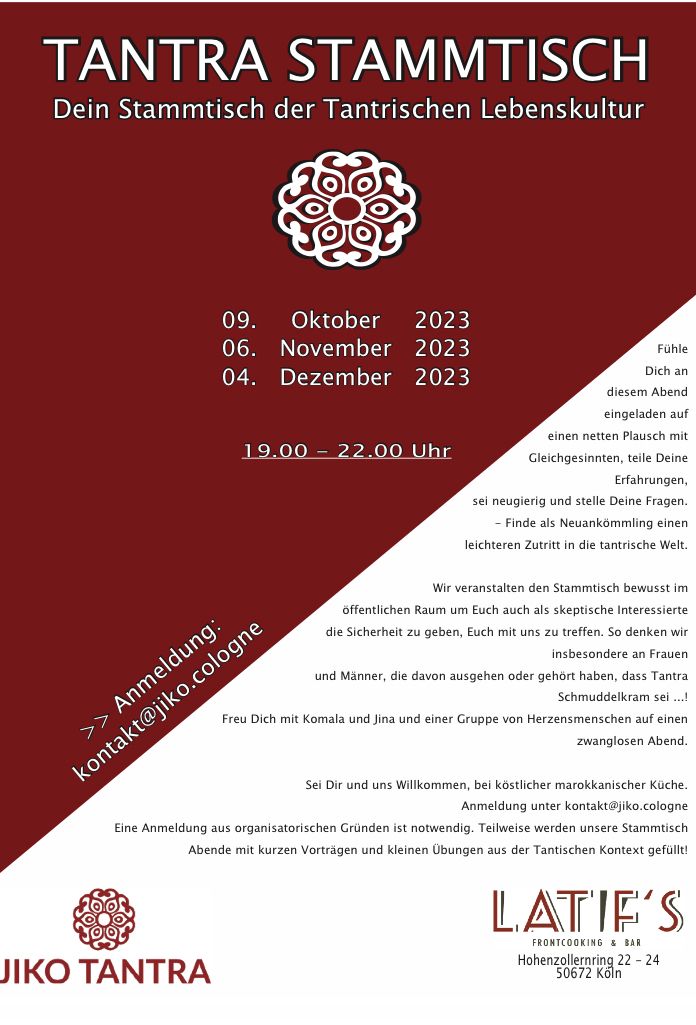 Anmeldung bis 3. Dezember 2023 unter kontakt@jiko.cologne Eine Anmeldung ist aus organisatorischen Gründen notwendig. Teilweise werden unsere Stammtisch Abende mit kurzen Vorträgen und kleinen Übungen aus dem Tantrischen Kontext gefüllt!